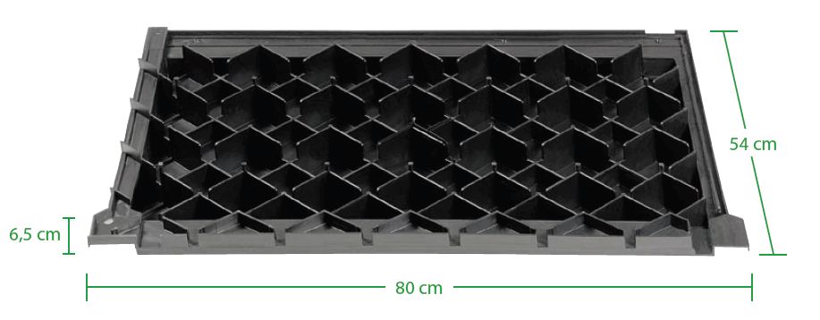 ANWENDUNG: Dachgefälle ≥ 25°Dachbegrünung: extensiv/ Steildach;Gründach-Pfanne;Deckmaß(LxBxH)ca.: 75x50x6,5 cmAbmessung ca.: 80x54x6,5 cm