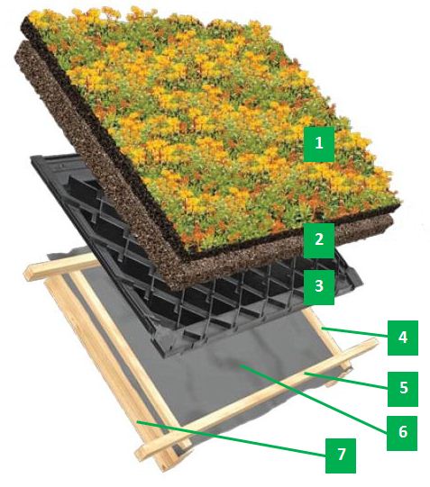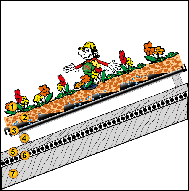 | Wurzelschutz: | ja - durch Konstruktion | Vegetationsschicht: | Sedum-Vegetationsmatten |