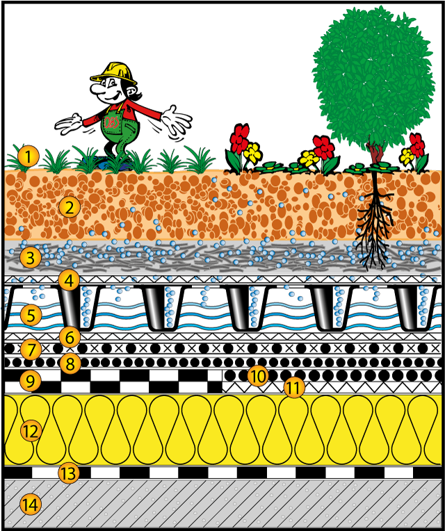 Produktinformationen "Gründach intensiv, Warmdach, ab 0% Gefälle, 46 Liter Wasserspeicher/m²"